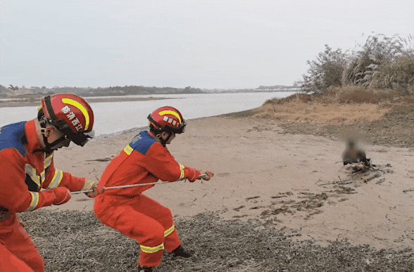 隨后,消防員一同用力拉拽安全繩