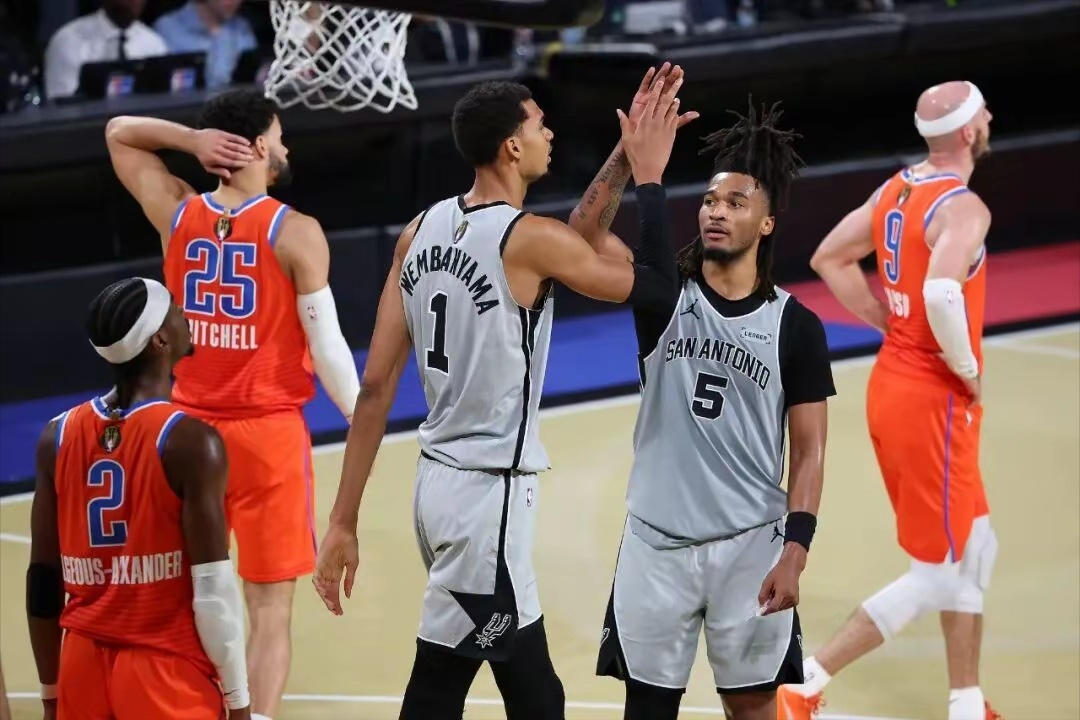 所以,兩隊的分差被迅速縮小,只剩4分。雷霆隊能做的,似乎只有用防守反擊得分,陣地戰根本沒有任何機會。而隨著文班亞馬在進攻端找回手感,這支完全體的馬刺隊,開始向雷霆隊這支看起來無法戰勝的高峰發起沖擊。隨著文班亞馬迎著哈滕大號三分干拔命中,半場結束前,馬刺隊將分差追至3分。易邊再戰,福克斯反擊上籃得手,成功完成反超。從一度落后16分到反超,這一波逆轉給足了馬刺隊信心。在這之后,馬刺隊一直穩住比分。不得不說,雷霆這樣年輕的冠軍球隊,看起來確實只有馬刺這樣同樣年輕,也同樣有競爭力的球隊才能對其造成威脅。