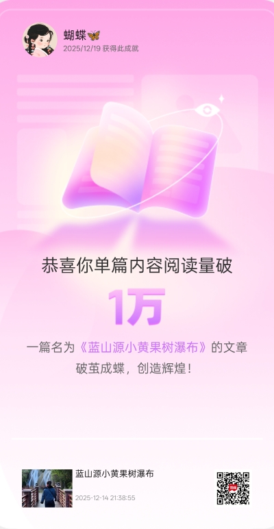我發的巜藍山源小黃果樹瀑布》閱讀量過萬了,謝謝每一位閱覽過的朋友!