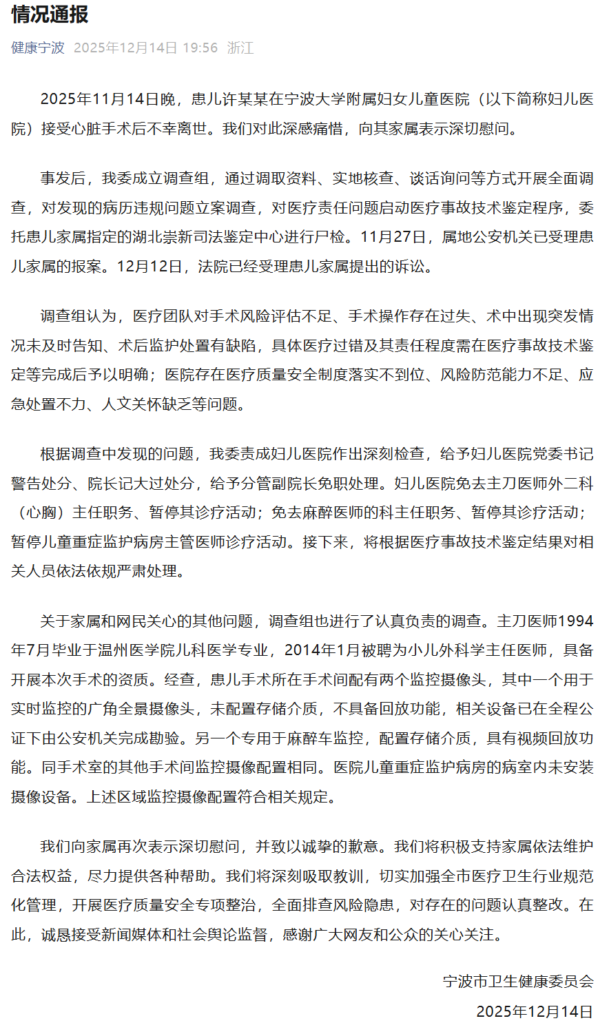 12月14日,寧波市衛生健康委員會就患兒許某某在寧波大學附屬婦女兒童醫院接受心臟手術后不幸離世一事發布情況通報。