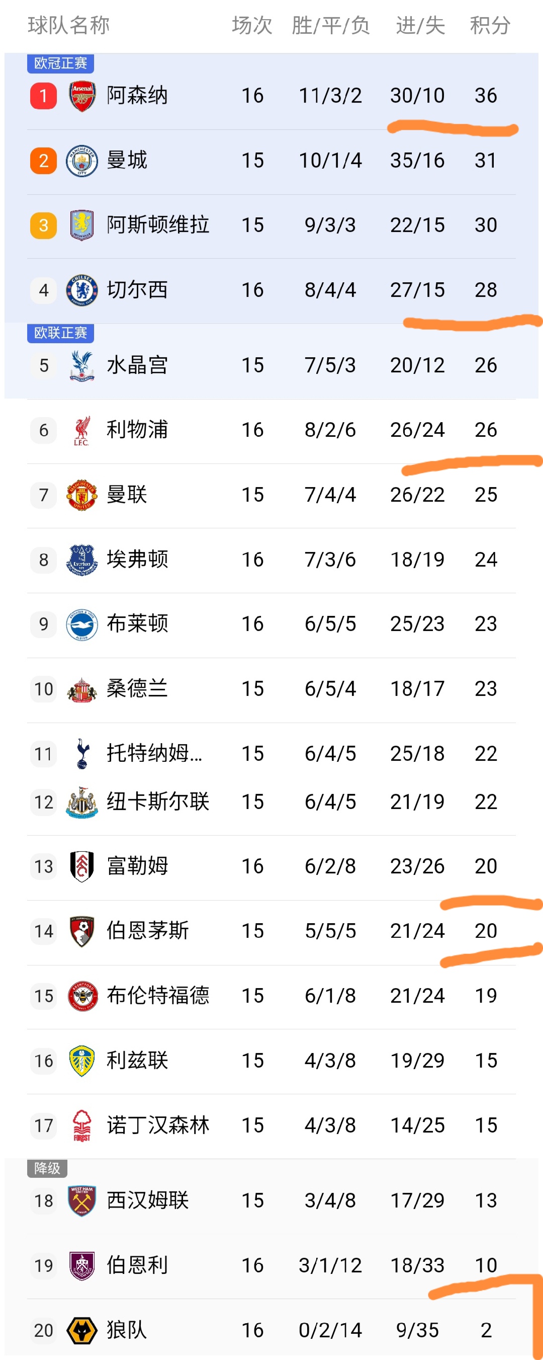 今天凌晨,英超第16輪結束多場較量,在今天的比賽結束之后,英超的積分榜得到更新,我們來看看目前英超的積分排名情況。