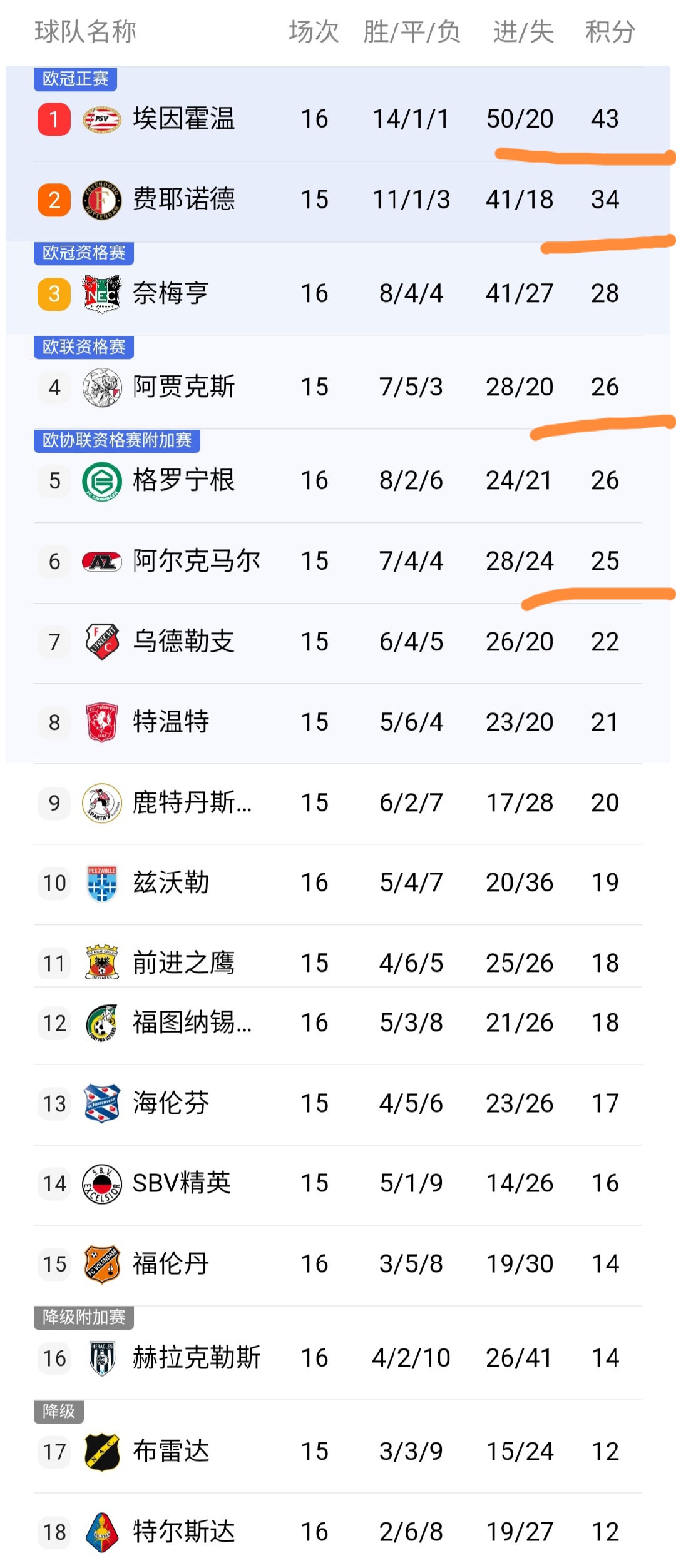 可以看到積分榜情況:可以看到埃因霍溫在本輪取得勝利之后,積分達到了43分,暫時領先范佩西執(zhí)教的費耶諾德隊9分之多,可以說埃因霍溫在荷甲勢頭強勁啊,而阿賈克斯目前少賽一場落后榜首17分之多,這顯然是令人大跌眼鏡的事情,以前往往都是阿賈克斯跟埃因霍溫爭奪榜首,如今阿賈克斯早早就掉隊了,阿賈克斯想奪冠基本不可能了,因為阿賈克斯本賽季太不穩(wěn)了,已經有8場比賽丟分,踢了15場有超一半的比賽都丟分,這樣的球隊基本不可能有奪冠的希望。目前就看費耶諾德隊能夠挑戰(zhàn)埃因霍溫了,希望范佩西能率領費耶諾德隊奪得荷甲冠軍,加油范佩西。