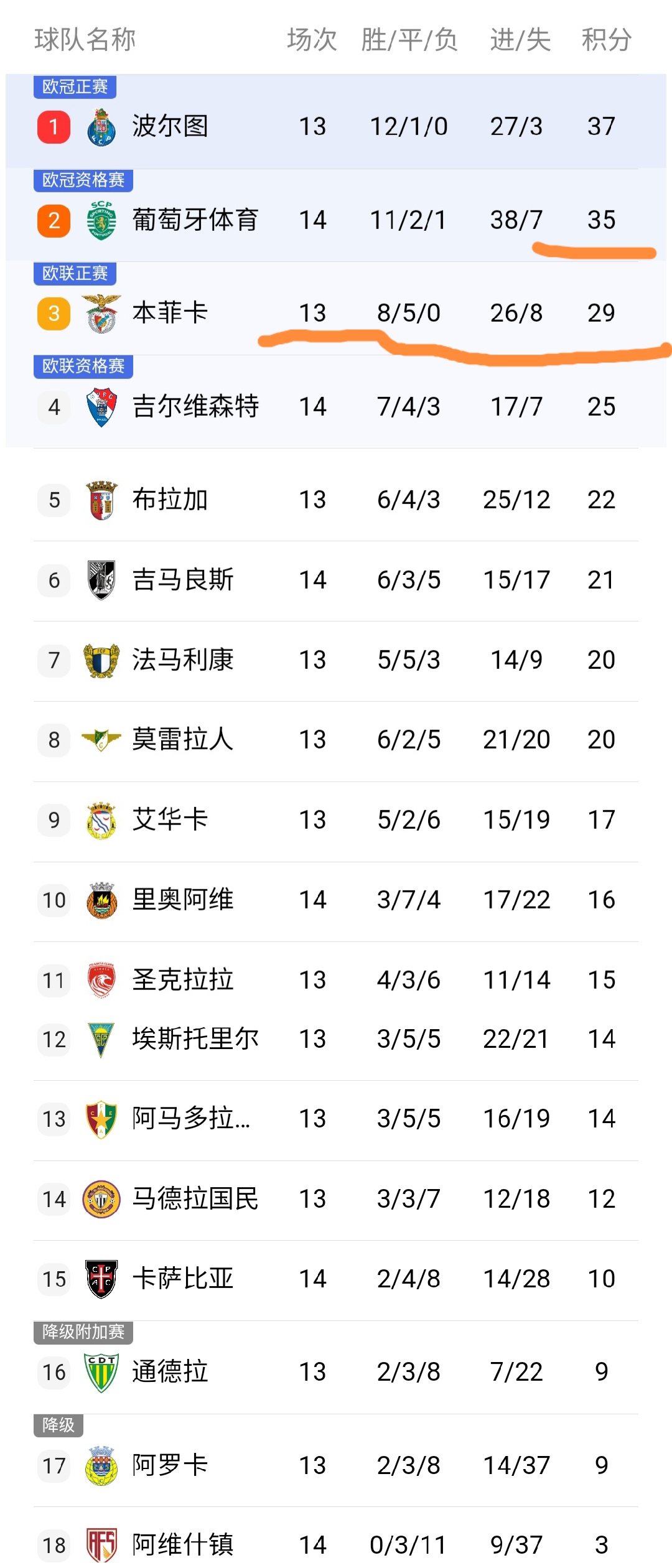 比賽結束之后,今天最新葡超積分榜情況:可以看到在積分榜排名第一的是穆帥的老東家波爾圖隊,波爾圖少賽一場積分都達到了37分,領先第2的葡萄牙體育隊2分,同時領先第3的穆帥執教的本菲卡隊達到了8分。可以看到,穆帥想率領本菲卡爭奪葡超冠軍還是比較難的,前面有葡萄牙體育和波爾圖兩個強勁對手。穆帥需要控制本菲卡丟分情況,可以看到本菲卡有5場比賽丟分的,是前三球隊中丟分場次最多的,雖然本菲卡還保持不敗,但是5場平局也是很傷人的,5場平局看起來都不敗,但是卻足足丟了10分,如果這5場比賽都取得勝利,那么本菲卡目前就是領頭羊了。當然沒有如果,就看穆帥怎樣調教本菲卡了,特別是防守方面需要加強。