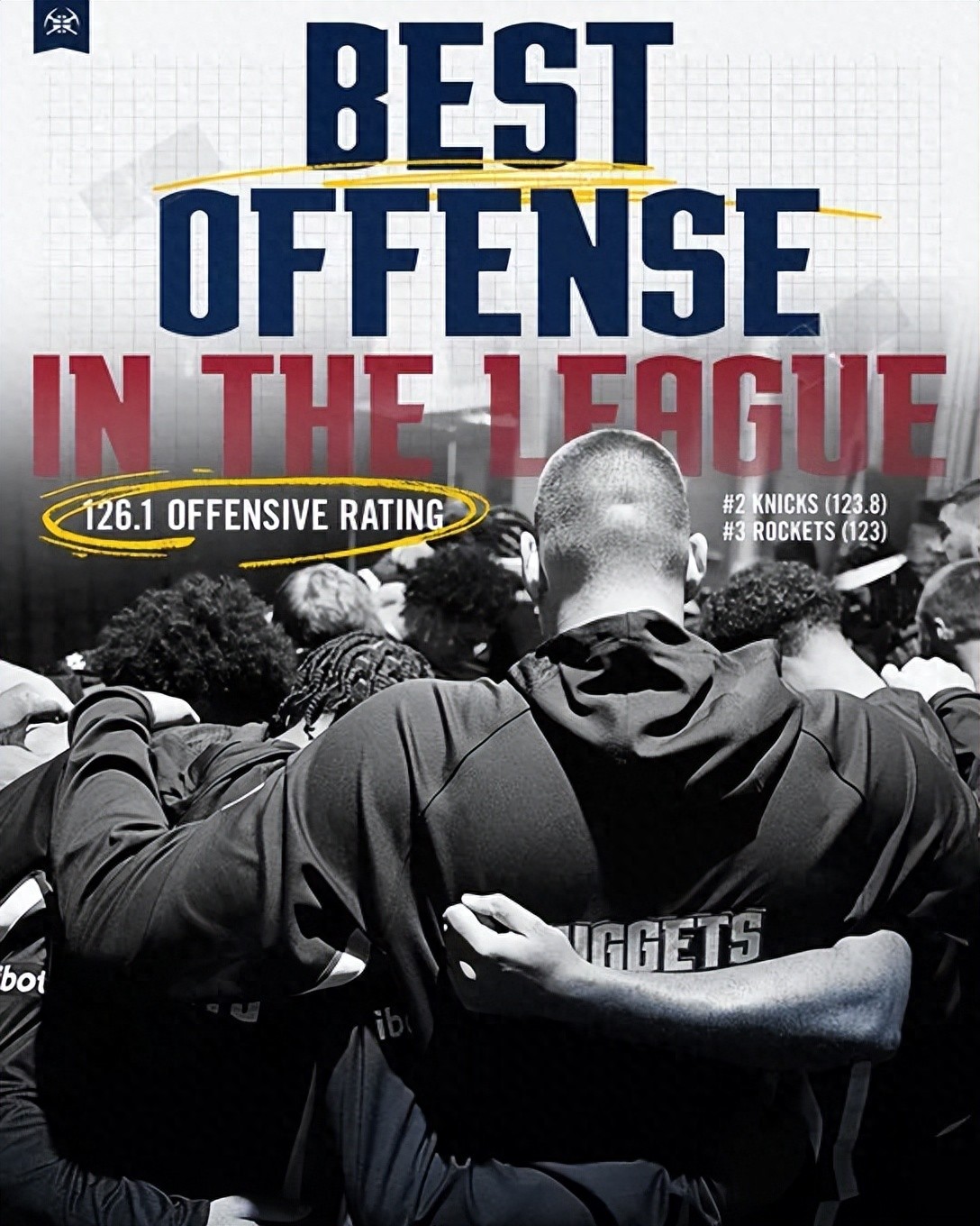 12月14日訊 今日,在籃球迷們的熱切關注下,NBA西部勁旅掘金隊的官方社交媒體賬號更新了一則令人矚目的動態。掘金隊官方精心制作并曬出了一張數據海報,旨在與廣大球迷分享球隊在本賽季至今所取得的優異進攻表現。
