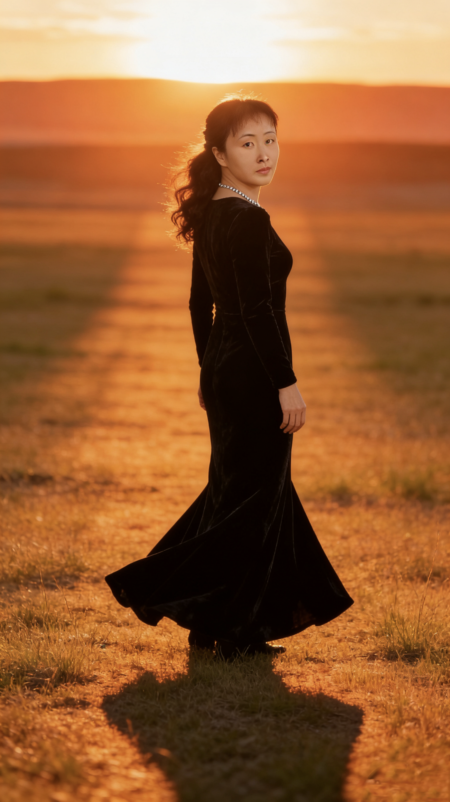 當草原的落日將天際染成熔金的模樣,逆光的光暈輕輕裹住身影,黑色絲絨裙擺被曠野的風掀起一角,側身回頭的瞬間,時光仿佛在此刻靜止。這不是刻意營造的浪漫,而是自然與心境的不期而遇——中年的從容,在草原的暮色里舒展;歲月的溫柔,在逆光的輪廓中定格。