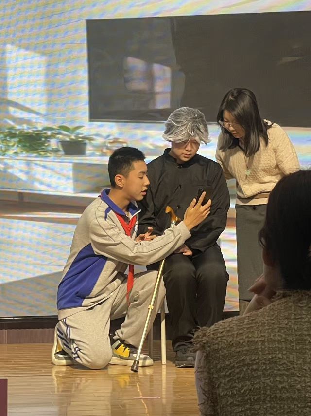 幕布拉開的瞬間,禮堂里的嘈雜忽然凝住,追光打在舞臺(tái)上,烏斯渾河的布景在光影里漾開波紋,蘆葦叢的道具在微風(fēng)里輕輕晃動(dòng),竟生出幾分真實(shí)的蕭瑟感。臺(tái)下的家長(zhǎng)們瞬間安靜下來,舉著手機(jī)的手不約而同地對(duì)準(zhǔn)舞臺(tái),前排的幾位媽媽還悄悄交換了一個(gè)期待的眼神。女兒穿著藍(lán)布軍裝,扎著麻花辮,和其他七位小演員手挽著手站在河邊,稚嫩的聲音里卻透著一股倔強(qiáng):“姐妹們!別和他們廢話了!早晚都會(huì)死,我們不如投河,至少死在家鄉(xiāng)的江水之中!”