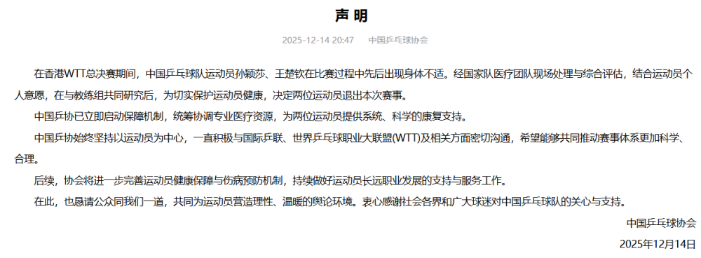 新華社北京12月14日電 中國(guó)乒乓球協(xié)會(huì)14日在其官網(wǎng)發(fā)布聲明,對(duì)國(guó)乒隊(duì)員孫穎莎、王楚欽在世界乒乓球職業(yè)大聯(lián)盟(WTT)香港總決賽期間因身體不適退賽作出回應(yīng)。協(xié)會(huì)表示,將進(jìn)一步完善運(yùn)動(dòng)員健康保障與傷病預(yù)防機(jī)制,持續(xù)做好運(yùn)動(dòng)員長(zhǎng)遠(yuǎn)職業(yè)發(fā)展的支持與服務(wù)工作。