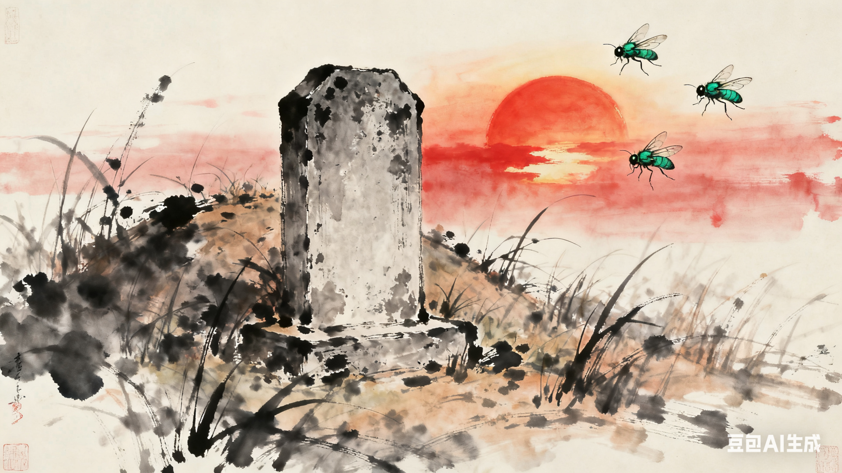 “自有青蠅充吊客,不愁荒冢絕人蹤?!薄扒嘞墶钡涑觥蹲髠鳌?,指死后只有蒼蠅為吊客,寫身后之冷落?!盎内=^人蹤”則進一步強化了孤獨與遺忘。這是“怒其不爭”的落點——哪怕落到如此境地,也不見真正的悔悟或掙扎,只有冷寂與自棄。
