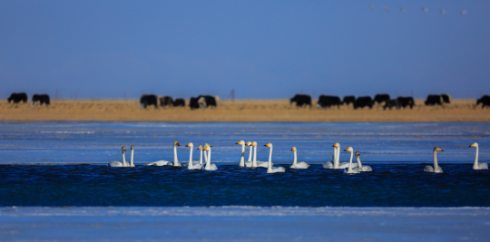 封凍后的青海湖并未陷入沉寂,反而成為生靈棲息的樂園。剛察縣仙女灣、四季天鵝湖等核心區(qū)域,已是大天鵝越冬的天堂。潔白的生靈或展翅掠過冰面,或悠然棲息于湖畔,與銀裝素裹的冰雪世界相映成趣,構成一幅靈動鮮活的高原生態(tài)畫卷。