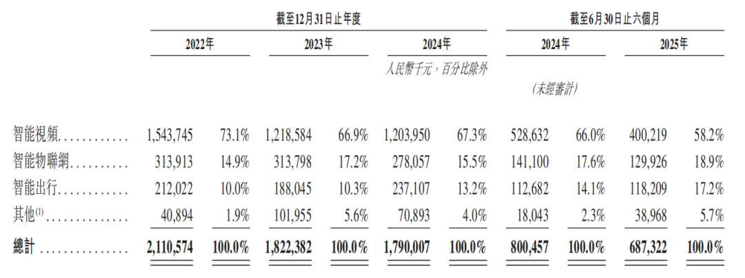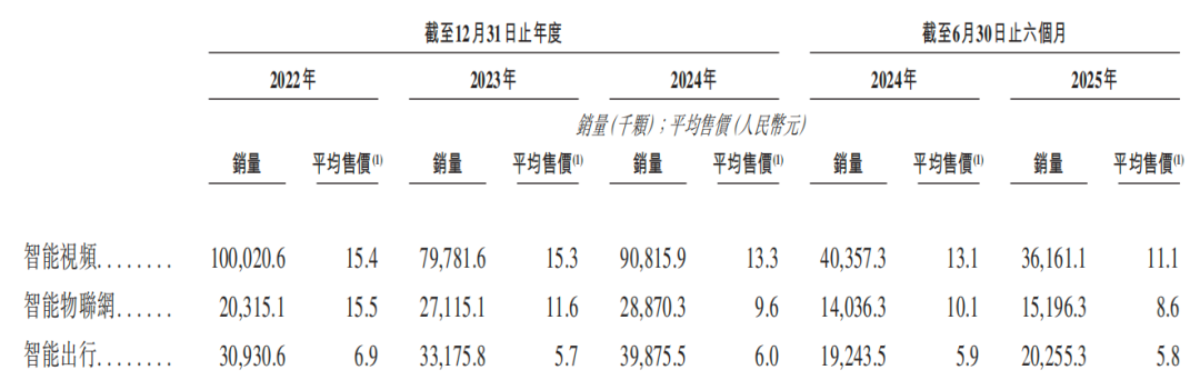 富瀚微的收入主要來(lái)自智能視頻產(chǎn)品的貢獻(xiàn),報(bào)告期內(nèi),該產(chǎn)品的平均售價(jià)從2022年的15.4元/顆降到2024年的13.3元/顆;2025年上半年,進(jìn)一步降至的11.1元/顆,同比一顆降了2元,累計(jì)降幅27.92%;同期,智能視頻產(chǎn)品銷(xiāo)量波動(dòng)下滑,2025年上半年同比減少10.34%,帶來(lái)收入同比減少24.29%,業(yè)績(jī)貢獻(xiàn)降至58.2%,較2022年的73.1%,減少14.9個(gè)百分點(diǎn)。