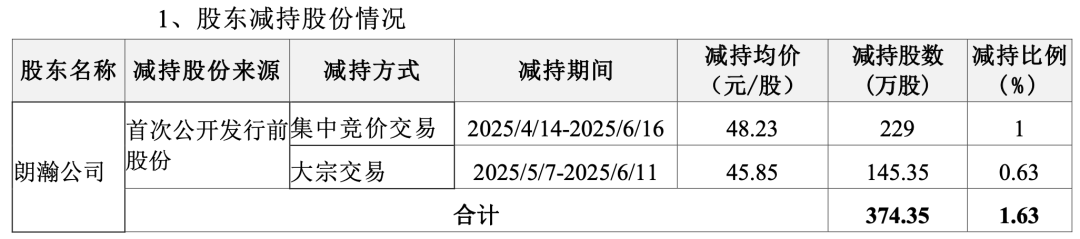 更早一點(diǎn)的時(shí)候,今年6月份,上海朗瀚因自身資金需求,完成減持374.35萬(wàn)股,變現(xiàn)1.77億元。