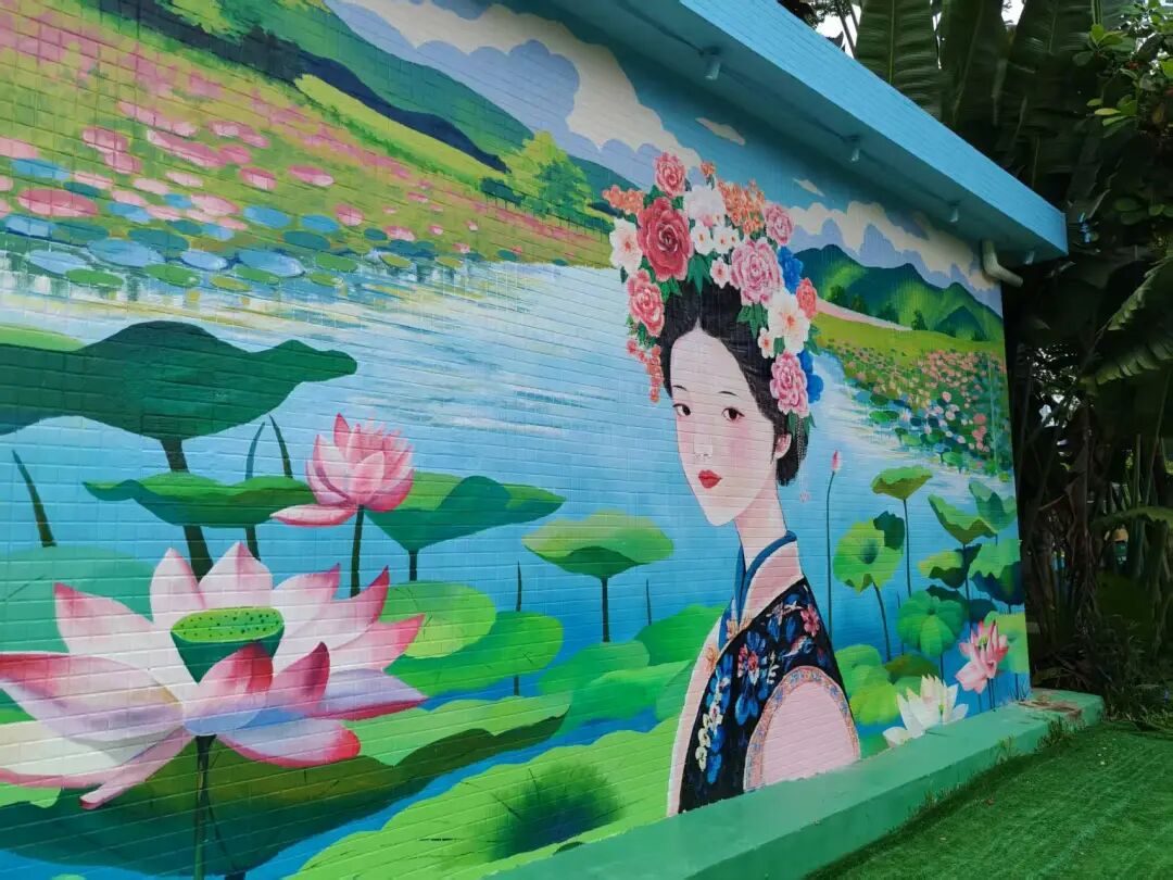 洪湖公園荷塘畔,一幅彩繪墻靜靜佇立。畫中一位簪花女子身著旗袍,側(cè)身凝望,與滿池荷花、青山遠黛相映成趣。藍綠色調(diào)與湖光水色融為一體,清新雅致中透出靈秀氣質(zhì)。