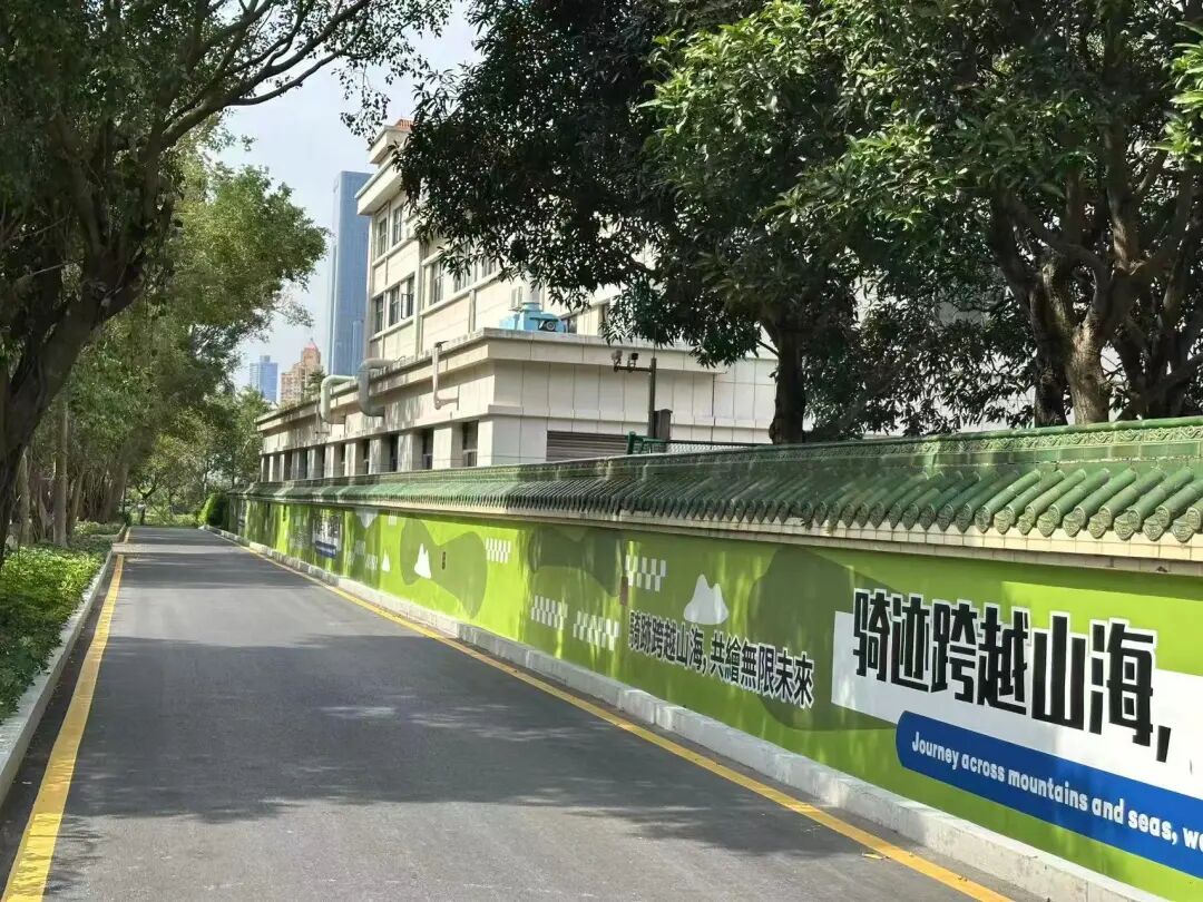深港騎行彩繪段位于東湖公園內(nèi)東湖二路一側(cè)及蓮塘口岸B口,以潮流插畫風格融合兩地文化元素與騎行場景。