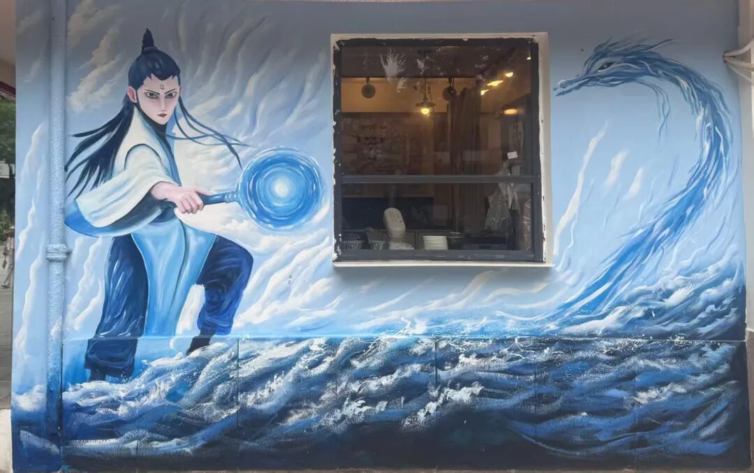 東湖公園的墻繪以哪吒、敖丙與太乙真人為題材,用濃郁的色彩與動感的線條重構(gòu)經(jīng)典神話。