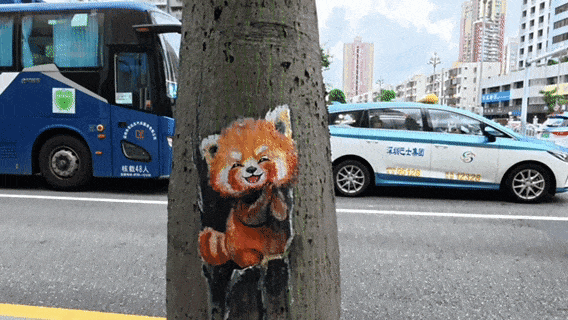 羅湖邀請藝術(shù)家在文錦南路、鳳凰路的行道樹上進行創(chuàng)作,將樹干的自然形態(tài)轉(zhuǎn)化為生動畫面。