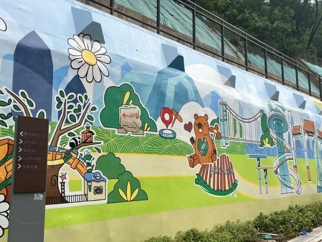 紅崗公園西馬嶺西出口的“八園連通”彩繪墻,生動詮釋了深圳市“山海連城”的生態(tài)理念。畫面巧妙串聯(lián)起公園節(jié)點與生態(tài)脈絡(luò),將羅湖“八園連通”的規(guī)劃成果以藝術(shù)形式呈現(xiàn)。