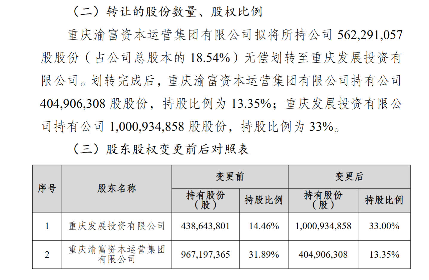 股權劃轉完成后,渝富資本持股比例由31.89%降至13.35%,重慶發展持股比例由14.46%升至33%,躍升為第一大股東。