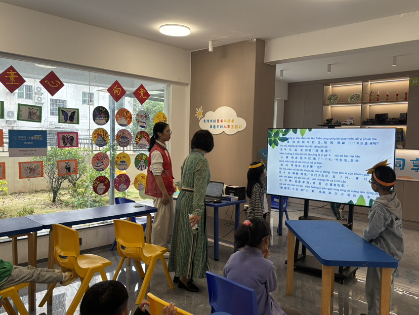 聽(tīng)完了故事,不如自己來(lái)演一演!五位小朋友勇敢地走上"舞臺(tái)",戴上精心準(zhǔn)備的頭飾,化身故事中的旁白、三只小雞和老牛。小演員們演得投入,臺(tái)下的小觀眾們也化身"小評(píng)委"看得認(rèn)真。通過(guò)親身演繹體驗(yàn),"禮貌待人"的道理不再是枯燥的說(shuō)教,而是變成了鮮活的場(chǎng)景和愉快的記憶。