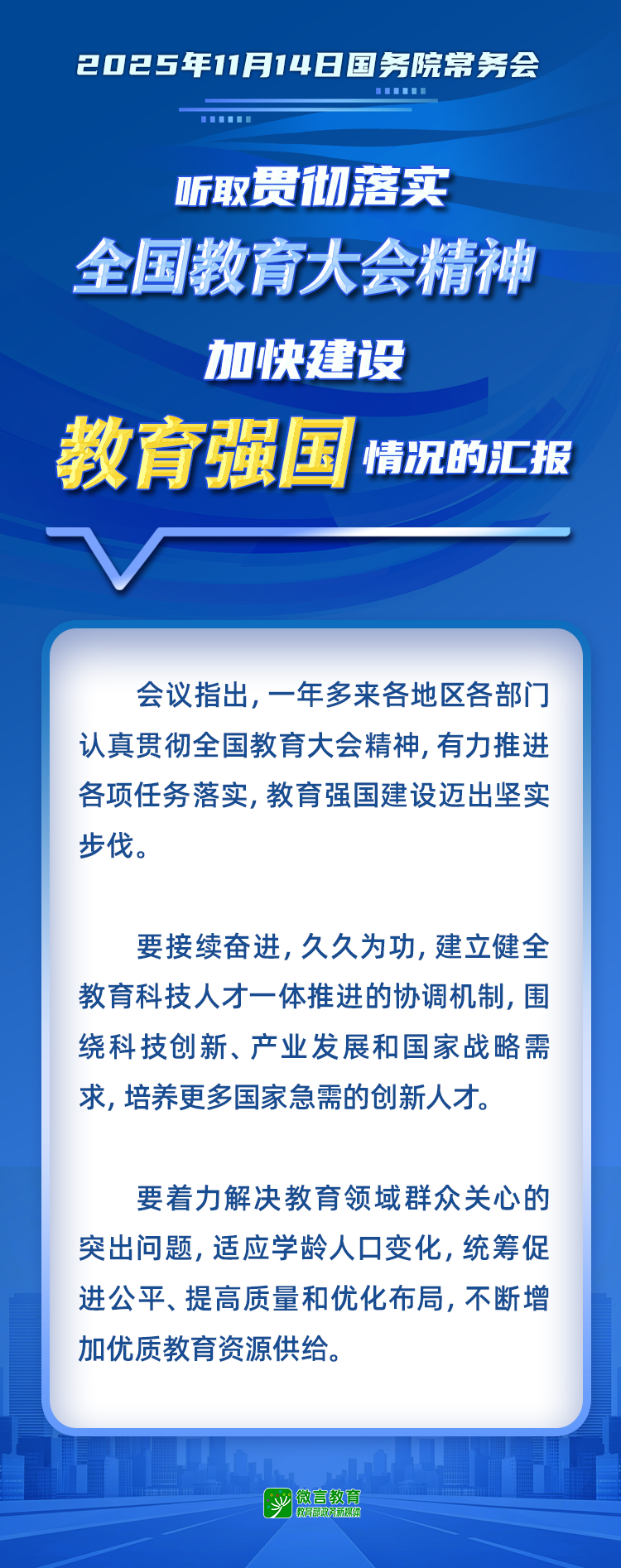 11月14日,國務(wù)院常務(wù)會議聽取貫徹落實全國教育大會精神加快建設(shè)教育強國情況的匯報。跟教育小微一起來看——