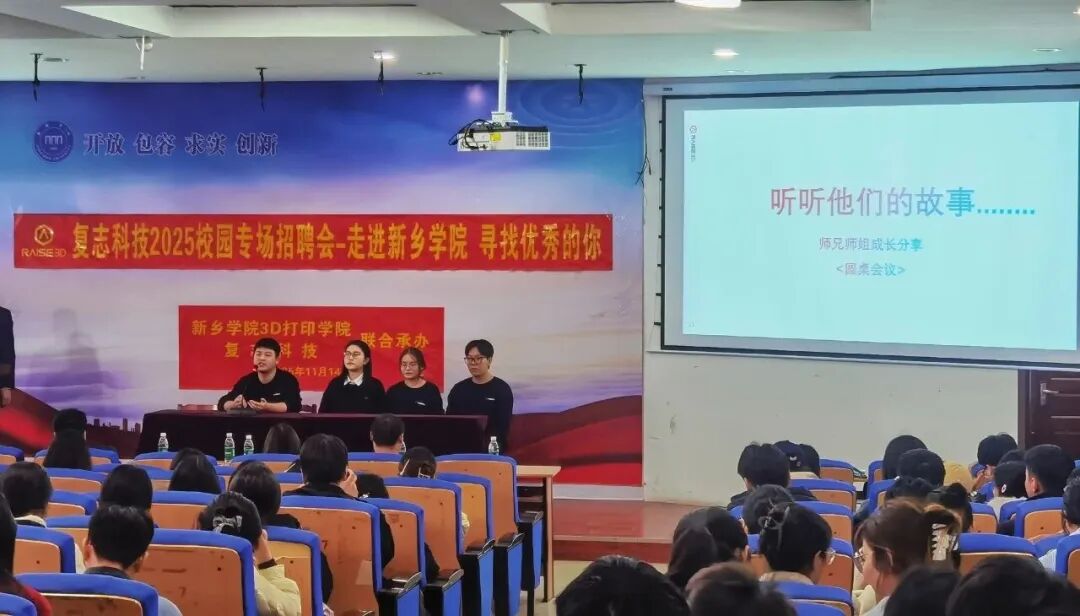 本次招聘會吸引了3D打印學院200余名學生聆聽宣講。作為專業級3D打印市場排名第三,被工信部認證為“專精特新小巨人”的復志科技公司,在3D打印學院的牽線和組織下,已是第三次來到新鄉學院進行校園秋招。本次由公司CEO封華帶隊,由4名已在職的3D打印學院畢業生校友現場分享。校友們結合自身成長軌跡,分享了工作時的經驗與故事,傳達了自身崗位的工作內容與特點,公司營造包容溫暖的氛圍以及“關注個人發展、提供多元發展機會”的人才培養文化,讓大家對求職對象更加了解,對工作前景更加明晰。