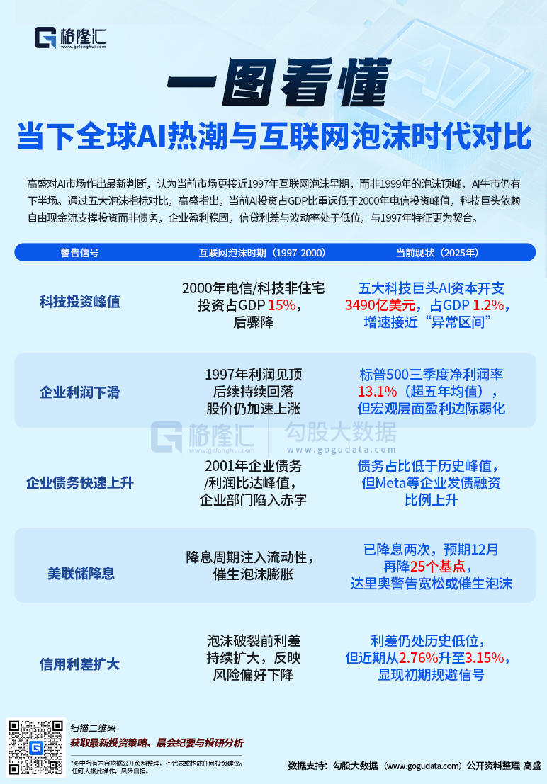 判斷泡沫看“信用利差”(企業借錢成本),利差越大,市場越恐慌。1999年泡沫前,利差“持續暴漲”,市場對科技業徹底失去信心;現在利差僅從2.76%升至3.15%,雖有“避險信號”,但仍處歷史低位。