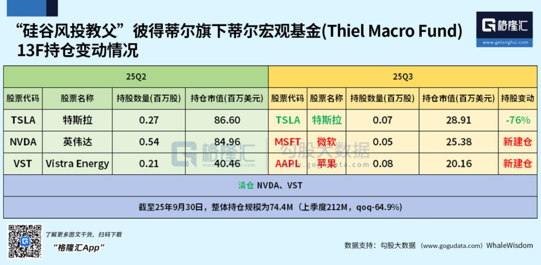 更關鍵的是,他沒離開科技圈,只是換了賽道:清倉英偉達的同時,新建倉微軟(4.9萬股)和蘋果(7.9181萬股),砍了76%特斯拉。