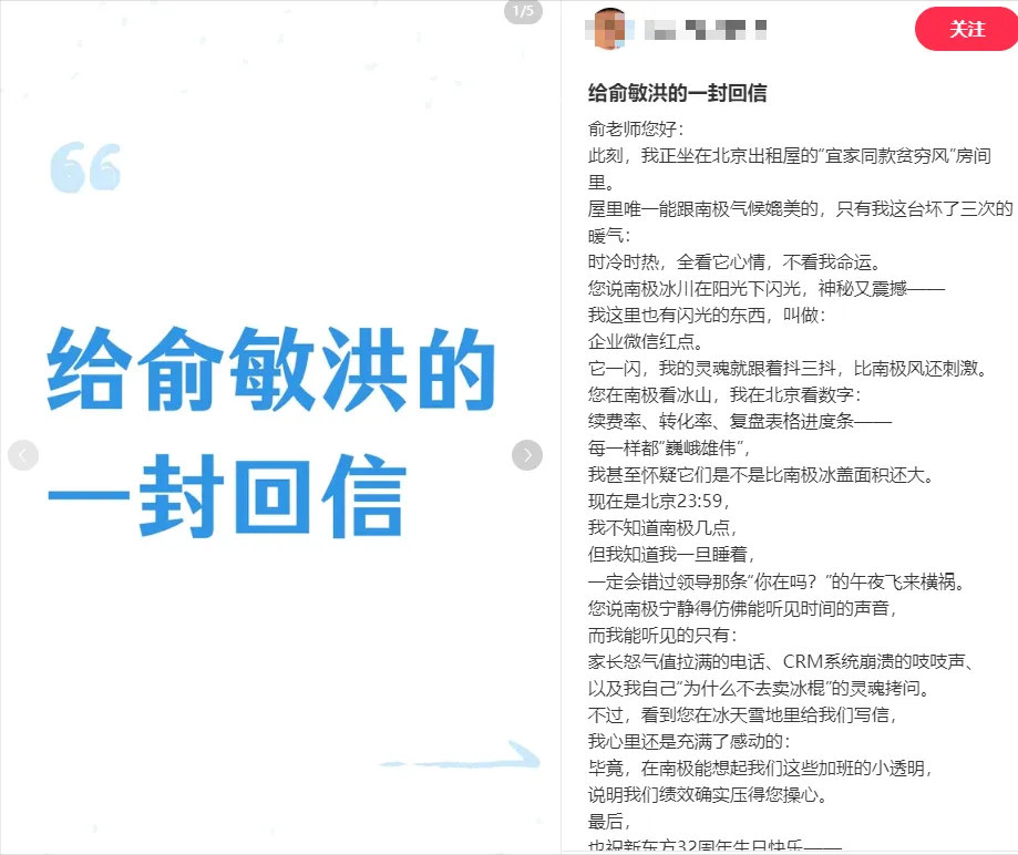 始料未及的是,這封激情滿懷的全員信,卻引發了大量員工的吐槽。“今夜,所有xdfer都是南極人”,“您在南極看冰山,我在出租屋看數字”之類調侃刷屏社交平臺,有員工宣稱無法與正在旅游的老板共情,喊話“老板寫得真有文采,但是周年慶感謝員工,你給我獎金了嗎?”