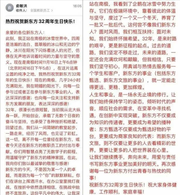 11月16日,新東方32周年紀念日,創始人俞敏洪在個人公眾號發布的一封全員信中,以“冰雪中的堅守”為主題,描繪“浩瀚的潔白”“翡翠般的冰山”等南極風光,感謝員工付出,擘畫公司未來:新東方要成為“希望的播種者”,東方甄選應成為“商家良知的代表”,新東方文旅則要“讓更多的人把世界裝在心里”。