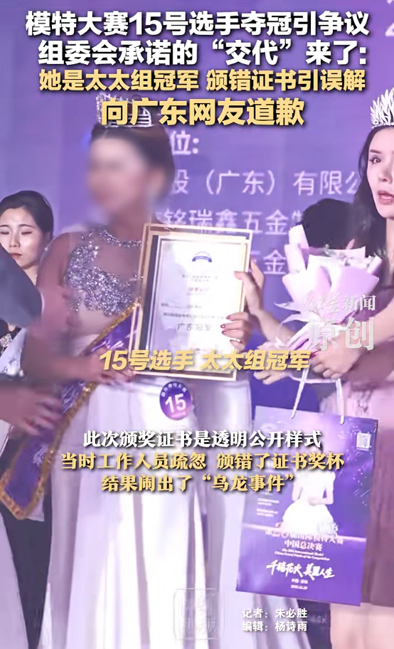 11月19日,大賽組委會(huì)副主席羅云琦告訴紅星新聞?dòng)浾撸?5號(hào)選手是太太組冠軍,比賽還設(shè)置兒童組和男模特組,女模特組廣東冠軍實(shí)際是37號(hào)女模特,此次頒獎(jiǎng)證書(shū)是透明公開(kāi)樣式,當(dāng)時(shí)工作人員疏忽,頒錯(cuò)了證書(shū)獎(jiǎng)杯,結(jié)果鬧出了‘烏龍事件’?!?/p>