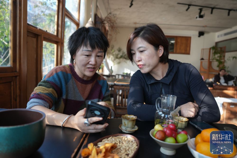 11月13日,民宿主徐小風(左)與董鳳潔在一起討論次日的游客接待安排。新華社記者 黃宗治 攝