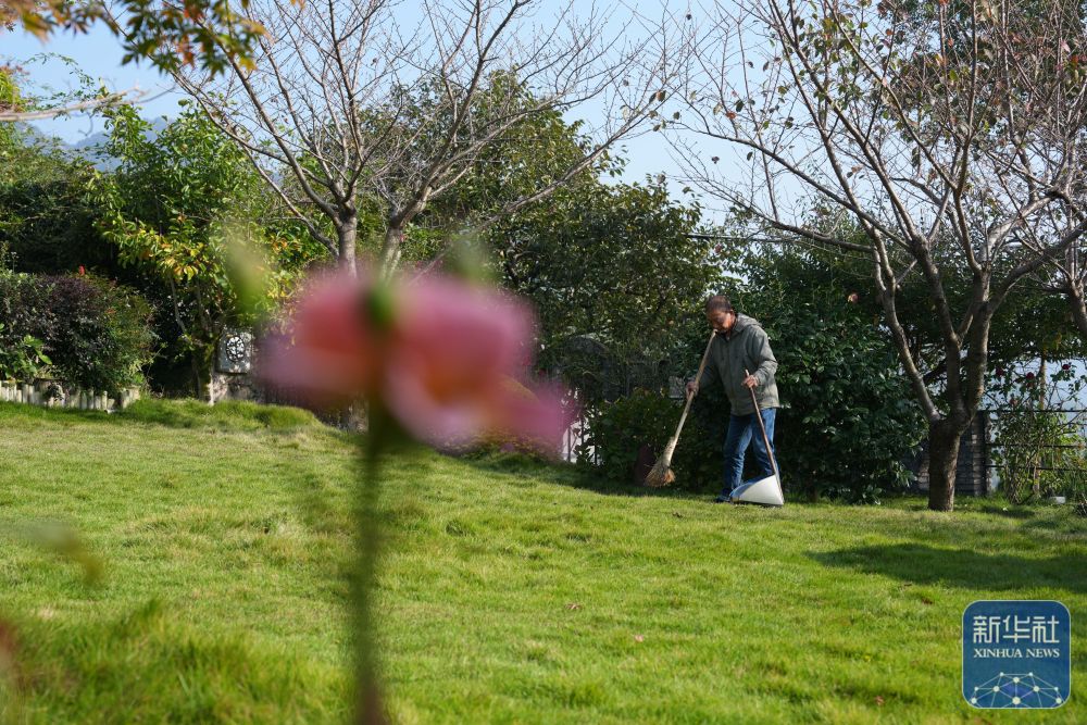 11月14日,受雇做清潔工的村民在東山村“花庭·東山上”民宿打掃庭院。