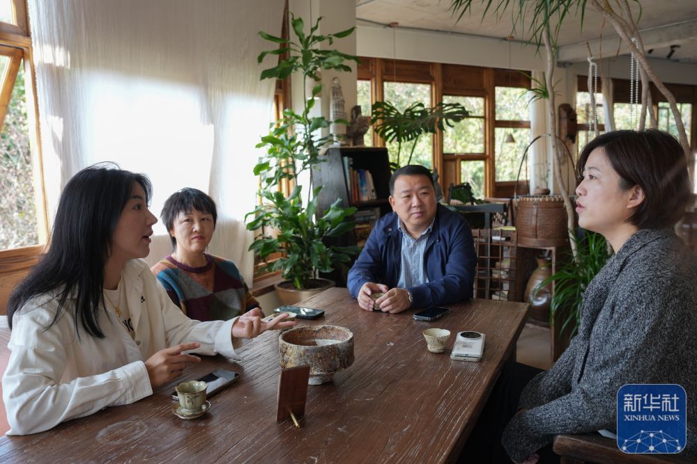 11月14日,民宿主徐小風(左二)、董鳳潔(右一)與東山村黨支部書記、村委會主任徐佩倫(右二)、東山村鄉村CEO胡亮玉(左一)在一起討論民宿及文旅綜合體項目發展。新華社記者 黃宗治 攝