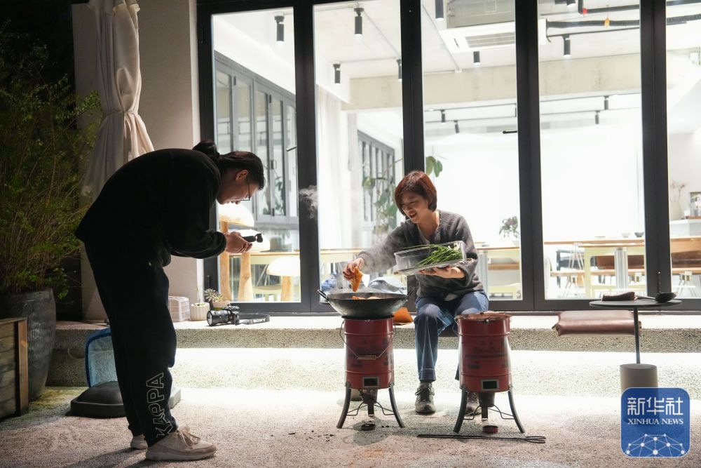 11月13日,東山村民宿主董鳳潔(右)在民宿內拍攝炒年糕的短視頻。2024年5月,董鳳潔打造的“東山祿房”民宿正式營業。她堅持拍攝短視頻,推介村里的美景、美食。新華社記者 黃宗治 攝