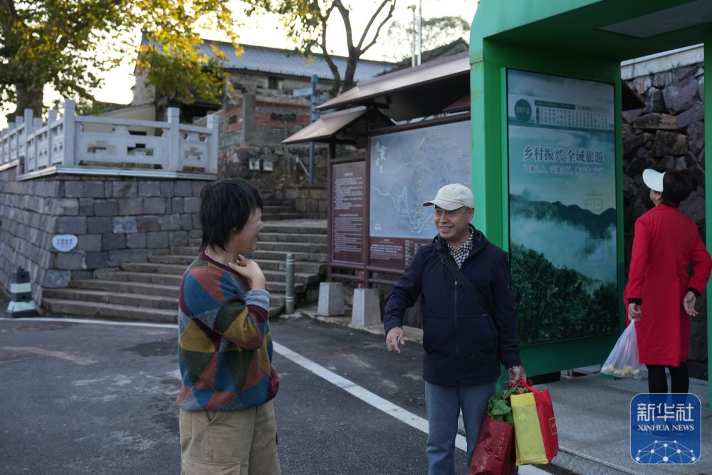 11月13日,東山村民宿主徐小風(左)與村民聊天。2019年起,徐小風扎根外婆的老宅,經營著“花庭·東山上”民宿,是村里民宿業的第一批“拓荒者”。新華社記者 黃宗治 攝