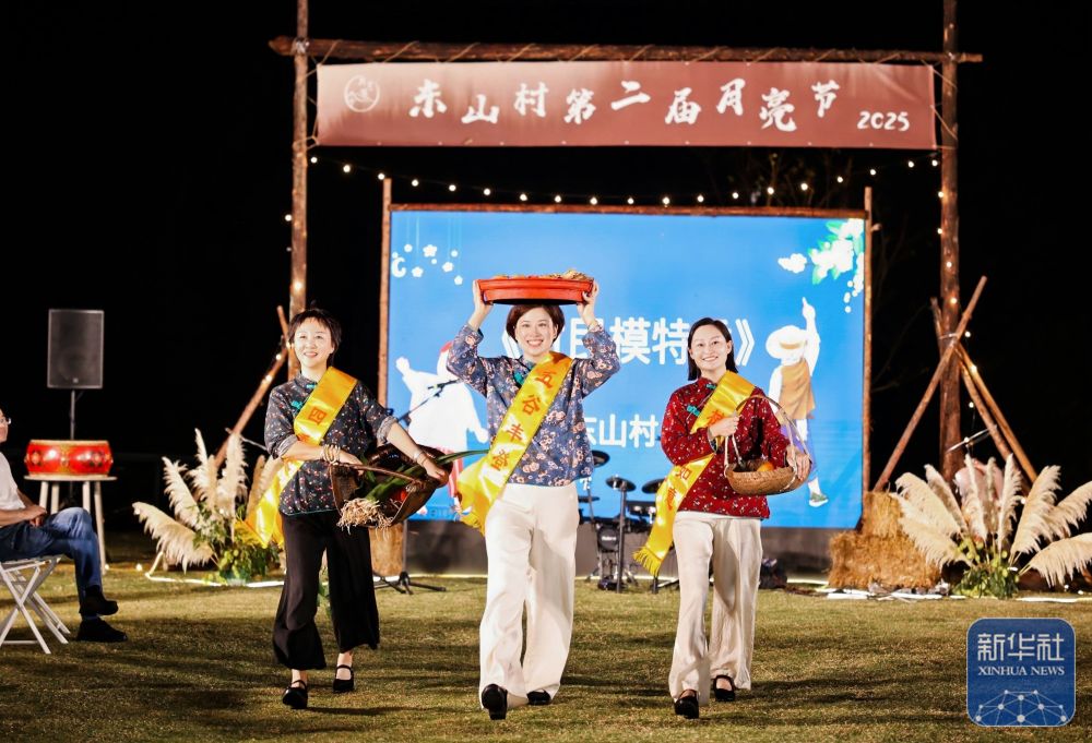 10月7日,東山村民宿主徐小風(左)、董鳳潔(中)與徐娜在共同發起與村民聯歡的“月亮節”上表演。新華社發