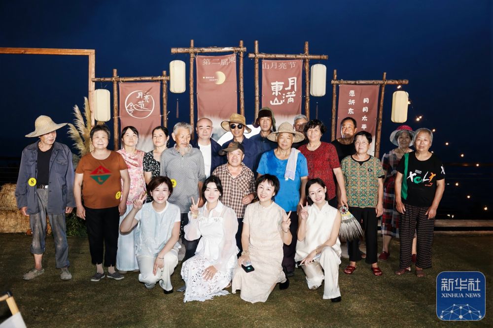 10月7日,東山村民宿主徐小風(前右二)、董鳳潔(前左一)與徐娜(前右一)在共同發起與村民聯歡的“月亮節”上與村民代表合影。新華社發
