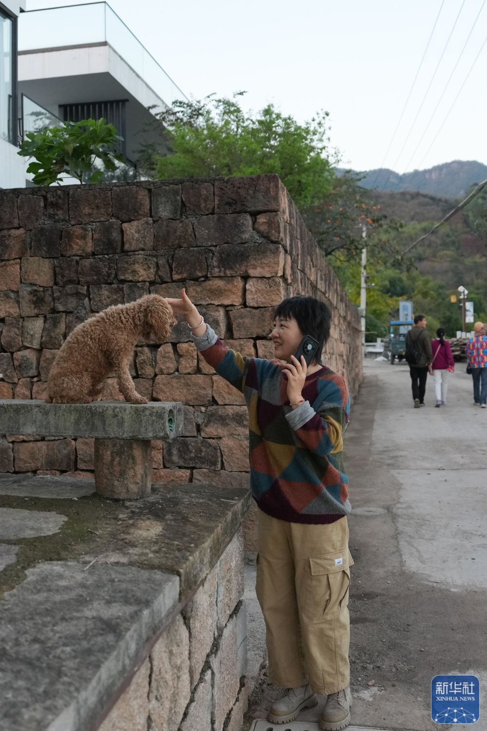 11月13日,東山村民宿主徐小風在村里閑逛時與小狗互動。2019年起,徐小風扎根外婆的老宅,經營著“花庭·東山上”民宿,是村里民宿業的第一批“拓荒者”。新華社記者 黃宗治 攝
