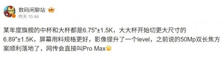 這與近日數碼博主“數碼閑聊站”的爆料也能相互印證,近日,該博主也爆料稱,“某年度旗艦的中杯和大杯都是6.75"±1.5K,大大杯開始切更大尺寸的6.89"±1.5K,屏幕用料規格更好,影像提升了一個level,之前說的50Mp雙長焦方案順利落地了,網傳會直接叫Pro Max”。