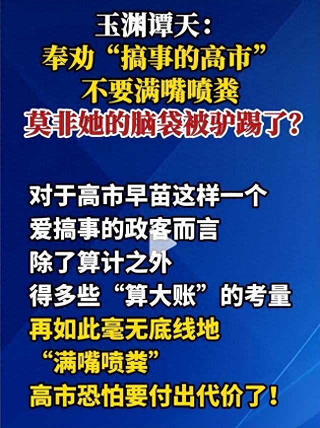 近段時間,中方的外交部、國臺辦等部門和機構都已經相繼對日本方面提出了強烈抗議和嚴正批評,讓日本感到了震動。尤其值得注意的是,筆者看到,“玉淵潭天”賬號已經直截了當地發文稱:“臺島有事,就是日本有事”,這話,高市早苗是怎么敢說出口的?莫非她的腦袋被驢踢了?另外,其還表示高市早苗:滿嘴噴糞。