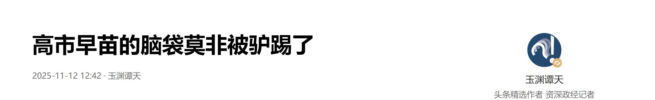 要知道,這個“玉淵譚天”可不是一般的媒體或者自媒體賬號,而是央視總臺旗下的一個新媒體賬號,也就是說,“玉淵潭天”其實可以被看做是央視的一個“小號”。我們知道,一般來說,權威媒體的內容發布都是極為嚴肅的,各種措辭也必然會字斟句酌,央視旗下賬號如今卻直截了當地表示高市早苗“腦袋被驢踢了”,這顯然說明中方對高市早苗的忍耐已經到了極限。