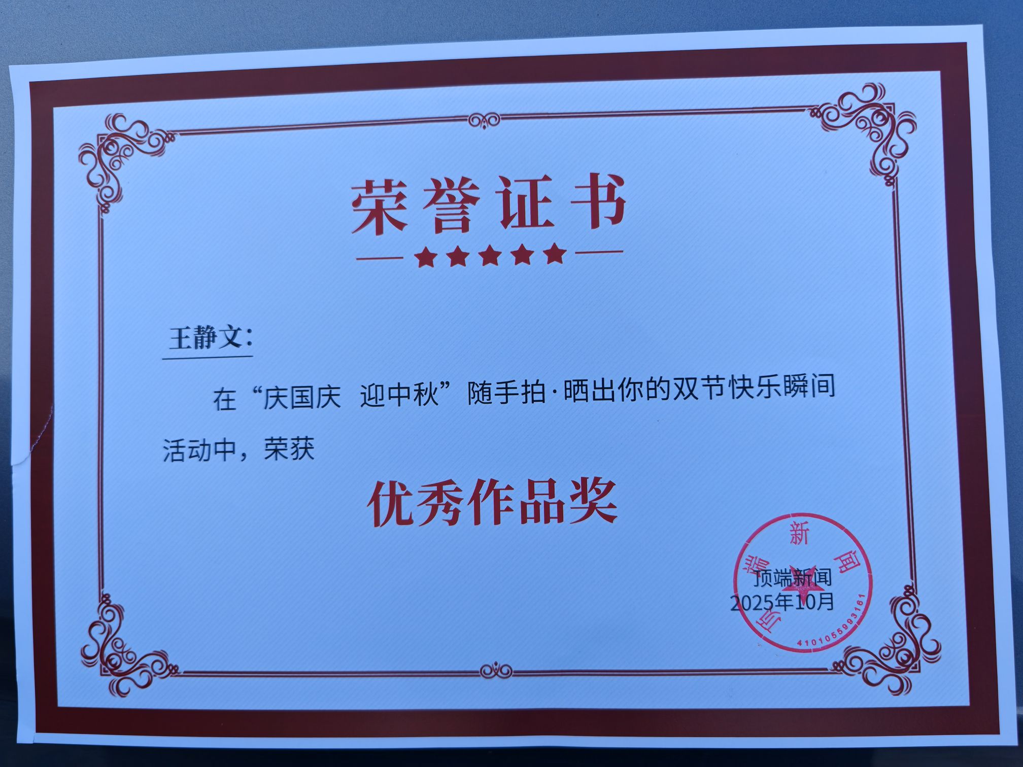 朋友們,大家好!能在“慶國慶迎中秋”隨手拍活動中榮獲優秀獎,我倍感榮幸與欣喜。雙節同慶的日子里,我用鏡頭定格下國旗飄揚的莊重、家人團聚的溫馨,這些平凡卻珍貴的瞬間,本是私藏的美好,卻因活動被看見、被認可。