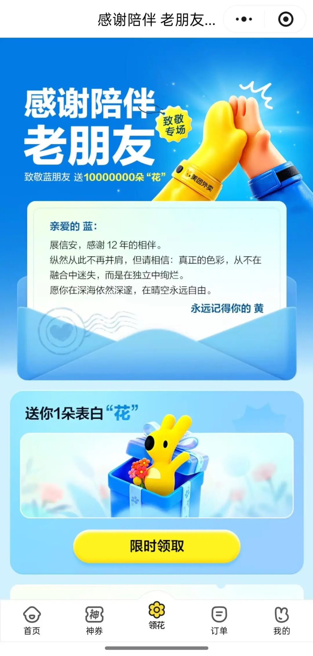 2025年11月14日,美團(tuán)外賣APP上線一項(xiàng)活動(dòng)——致敬藍(lán)朋友。用戶獻(xiàn)花即可領(lǐng)券。活動(dòng)頁(yè)面附上一封致“藍(lán)朋友”的信。