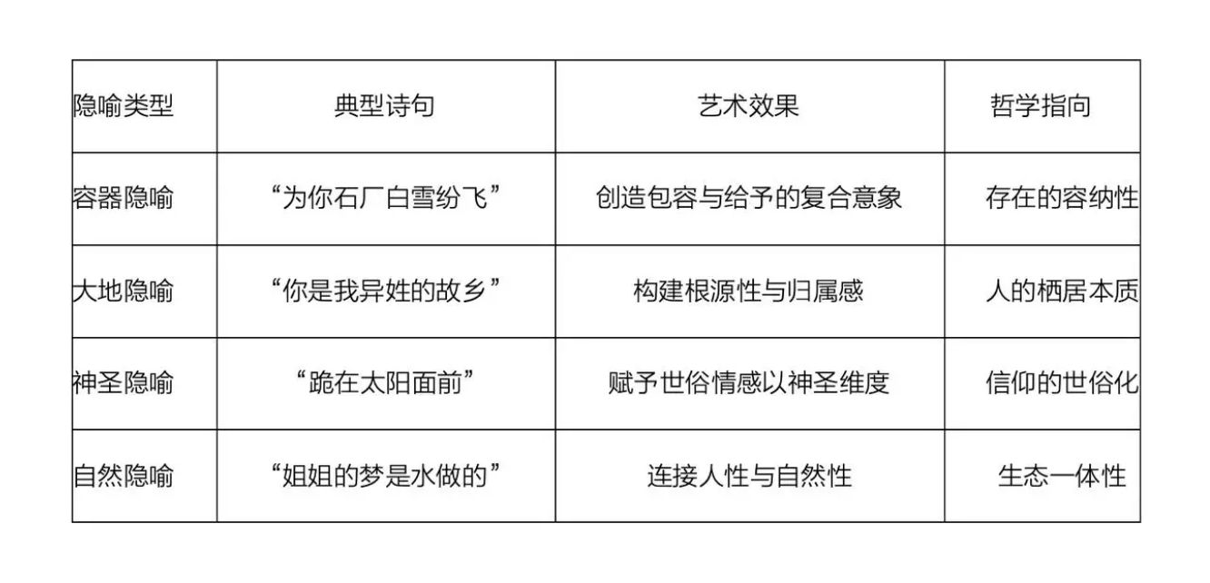 這些隱喻變體共同構成了一個圍繞“容器”核心的輻射性結構,使“姐姐”意象在不同的詩境中既保持連續性,又呈現豐富的多樣性。