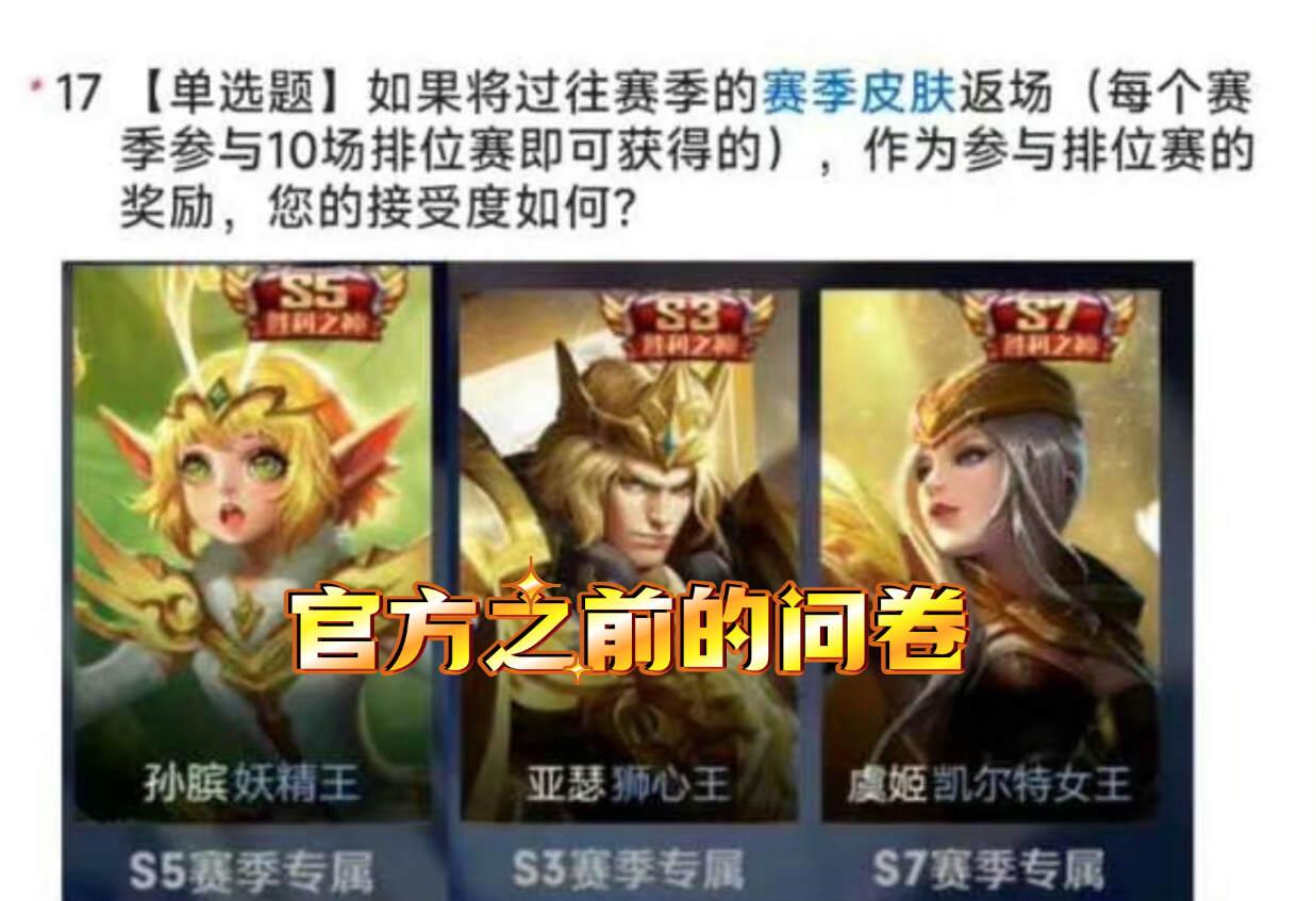而根據(jù)官方之前的舉動來看,好像確實是想要返場賽季限定皮膚,很早之前官方就發(fā)布過一個問卷,在當時就提到,如果過往賽季限定皮膚返場,大家是否能夠接受?