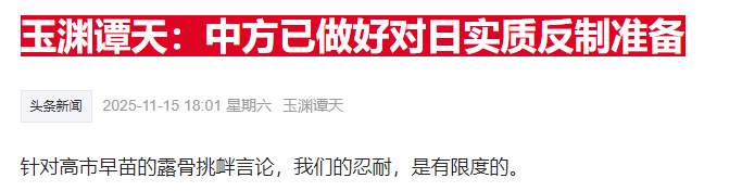 11月15日,玉淵譚天發文“中方已做好對日實質反制準備”。文中表示,針對高市早苗的露骨挑釁言論,我們的忍耐,是有限度的。如果日方執迷不悟,中國就沒有什么好再克制的了。