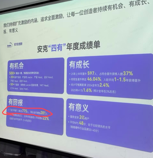 該截圖顯示,安克創(chuàng)新“百萬年薪”人數(shù)已經(jīng)達(dá)到775人,同比去年增加281人。