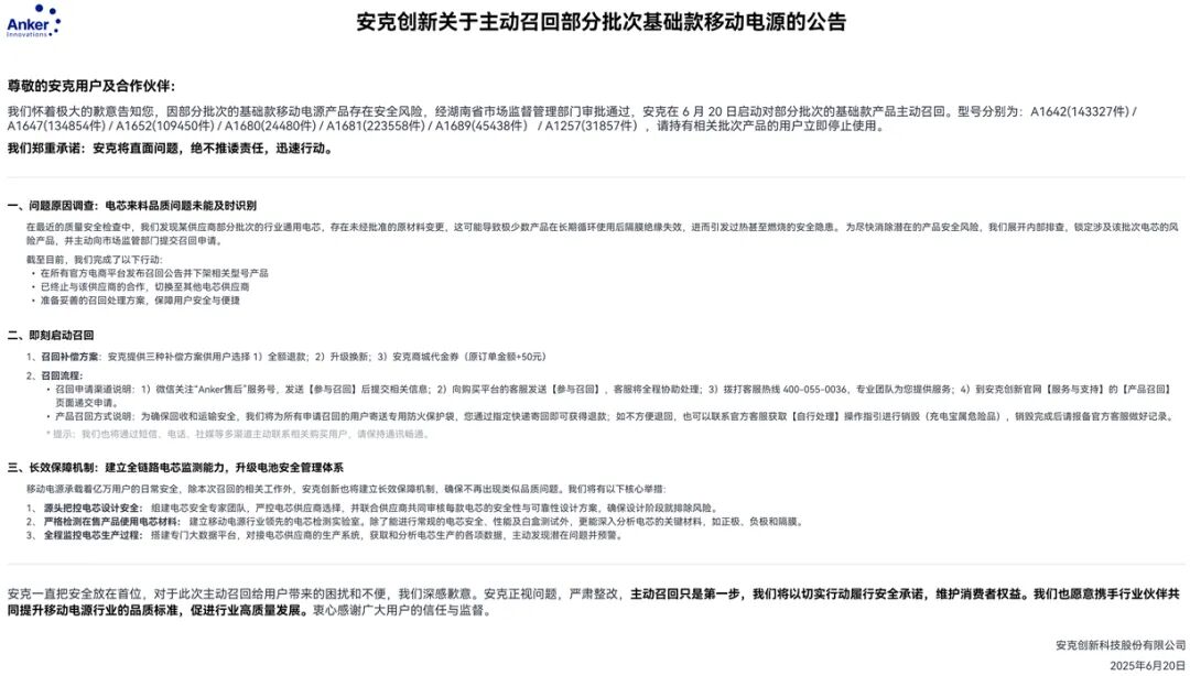 幾天后,安克創(chuàng)新宣布召回旗下7款充電寶,生產(chǎn)時(shí)間為2024年5月至2025年2月,規(guī)模約71.30萬件。