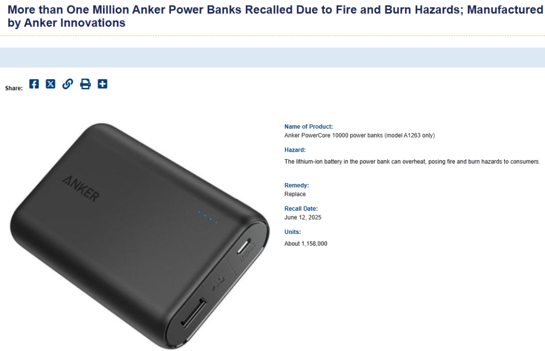 僅僅三個(gè)月后,9月18日,安克創(chuàng)新在美國再次發(fā)布召回通知,涉及2023年8月至2025年6月銷售的五種充電寶型號(hào)。