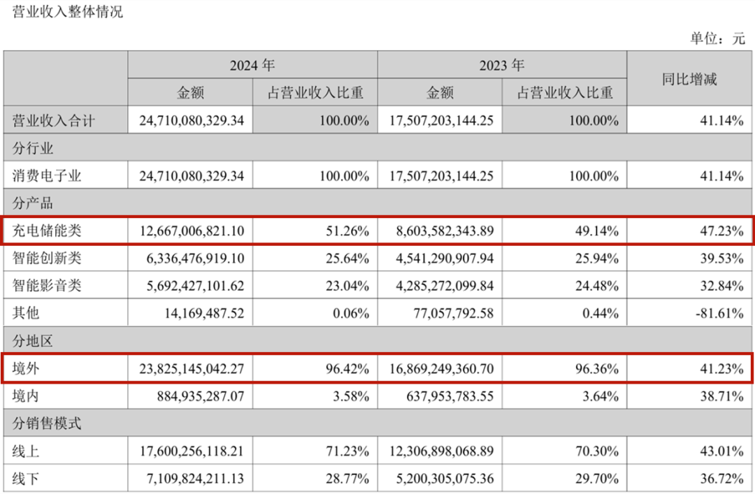 但對安克創(chuàng)新而言,更具指向性的并非增速,而是其極高的海外市場依賴度。