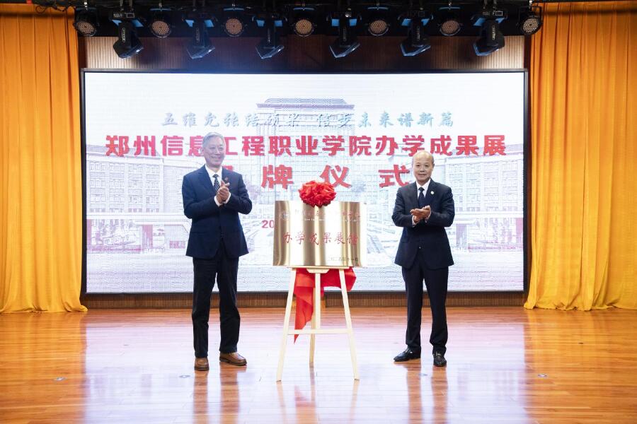 儀式上,董事長陶保富與副院長宋毛平共同為“鄭州信息工程職業學院辦學成果展館”揭牌,現場掌聲熱烈,標志著展館正式開放。